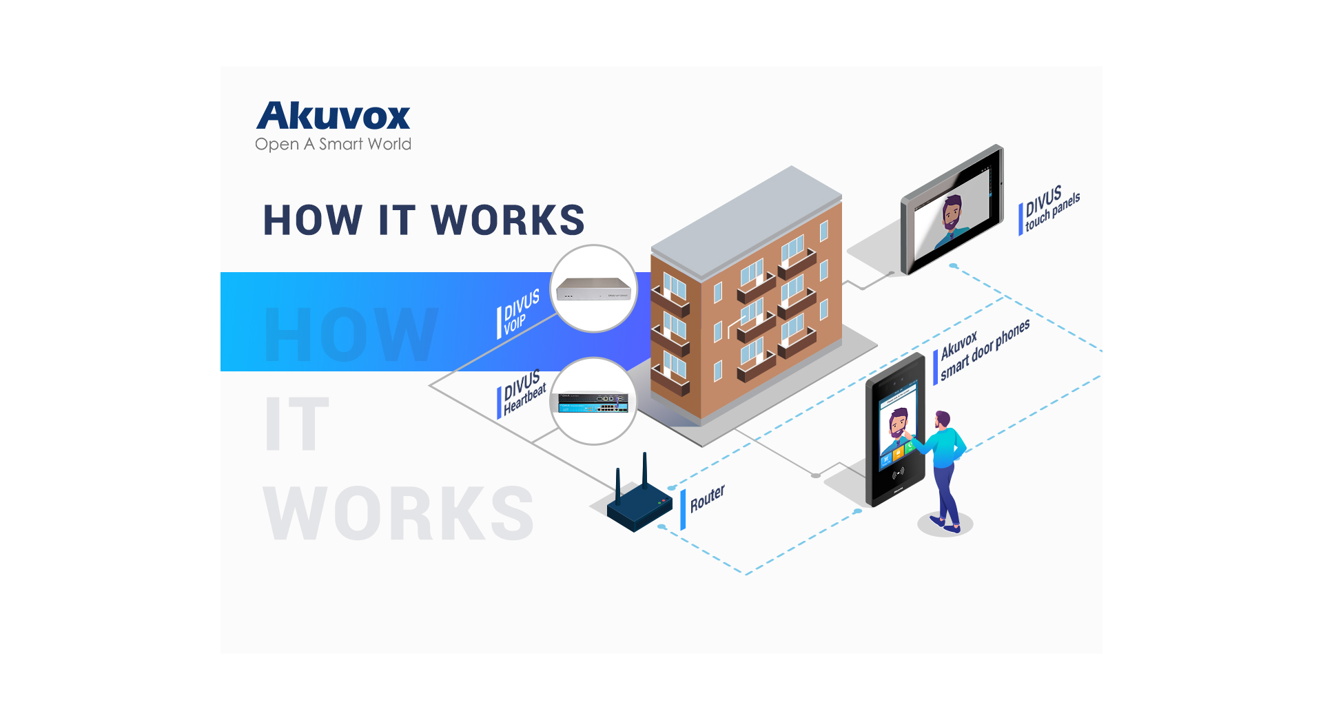 Akuvox's smart door phones are seamlessly compatible with DIVUS' indoor touch panels. DIVUS, renowned for its pioneering touch panel technology, now has its panels function as indoor intercom stations thanks to the SIP technology and the collaboration with Akuvox. SIP can enhance the communication between the two systems in terms of stability, security and flexibility. In this use case, DIVUS’ touch panels and Akuvox door phones are connected via DIVUS VoIP servers that can transmit encrypted voice and multimedia messages.