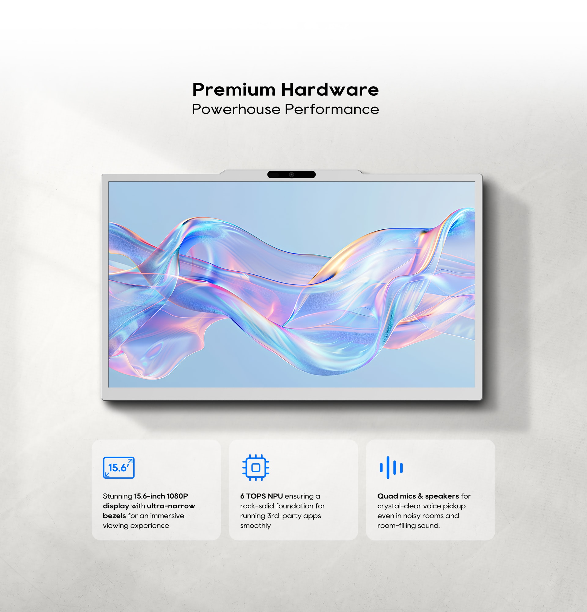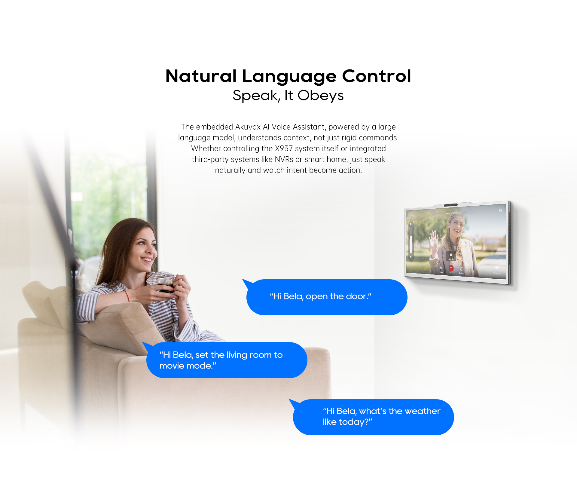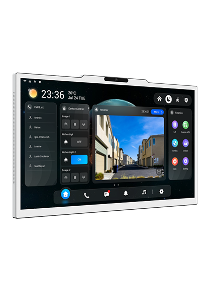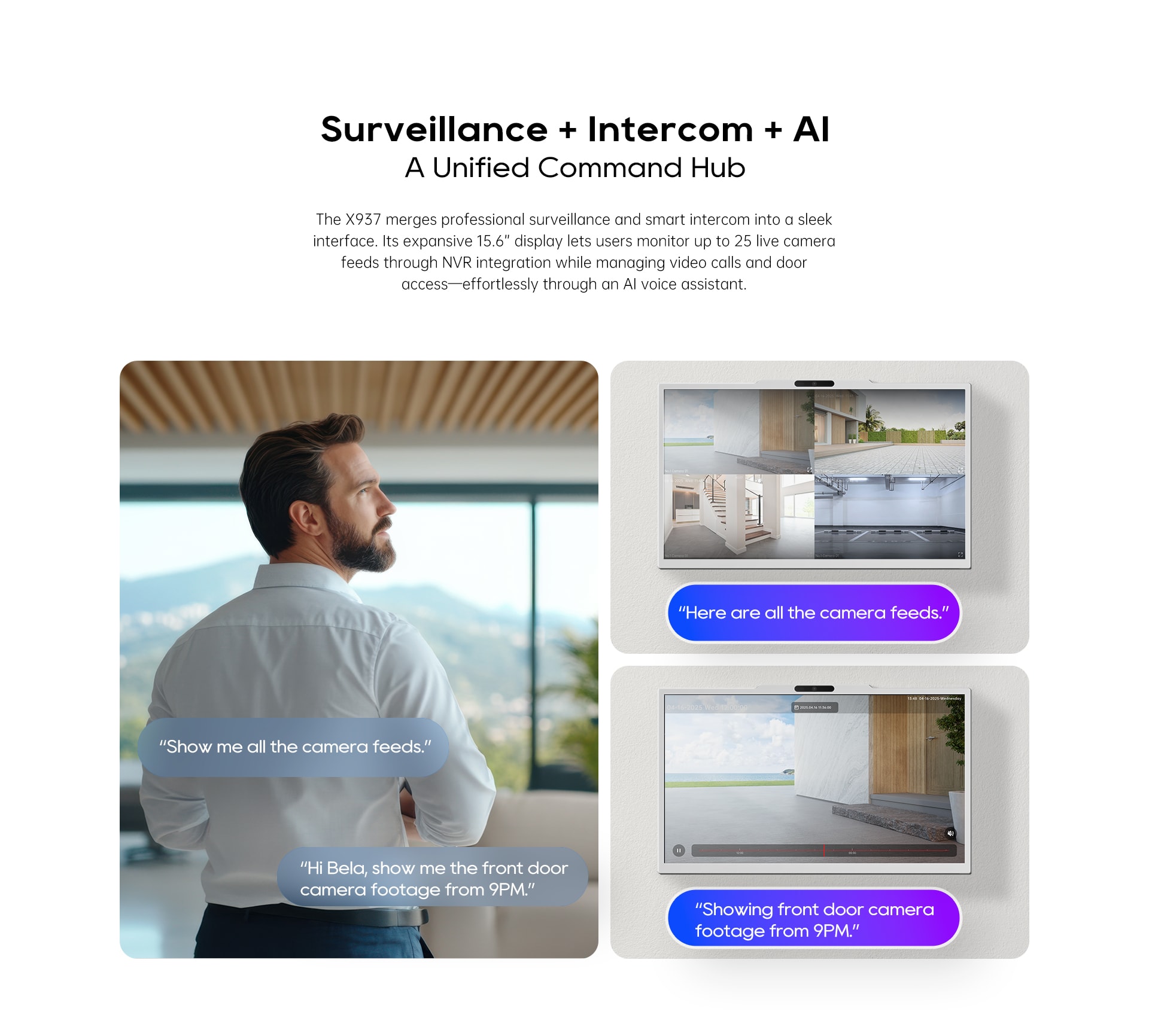 The X937 is a 15.6-inch indoor monitor running Android 14 OS. As the first smart indoor monitor of its kind, it integrates surveillance via HDMI-connected NVRs, smart intercom, and an LLM-powered voice assistant into a sleek, expansive interface.