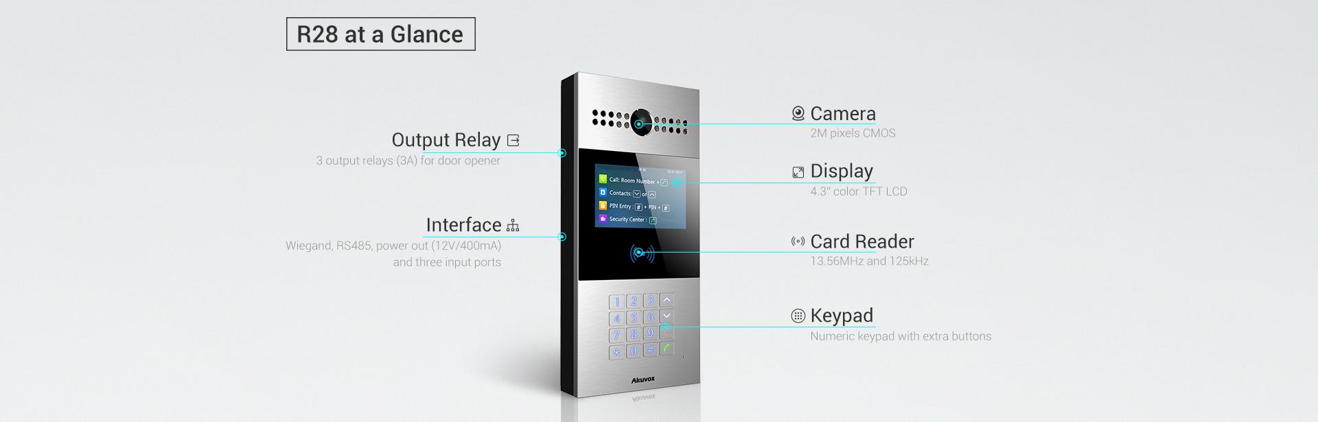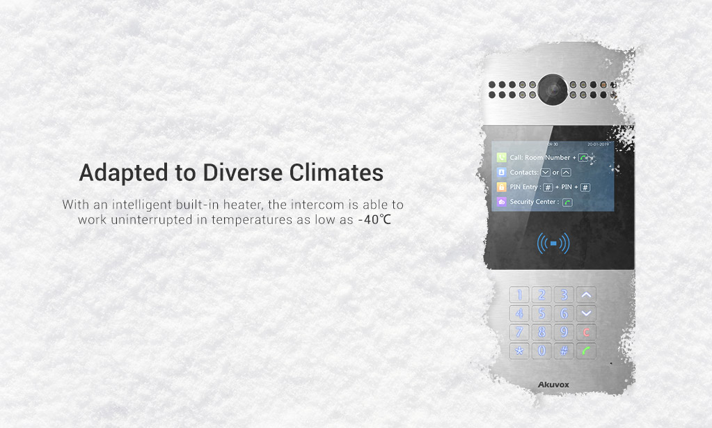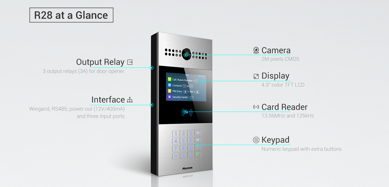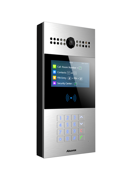 Akuvox R28 is a SIP video doorphone with a numeric keypad. It is typically used in apartment buildings.