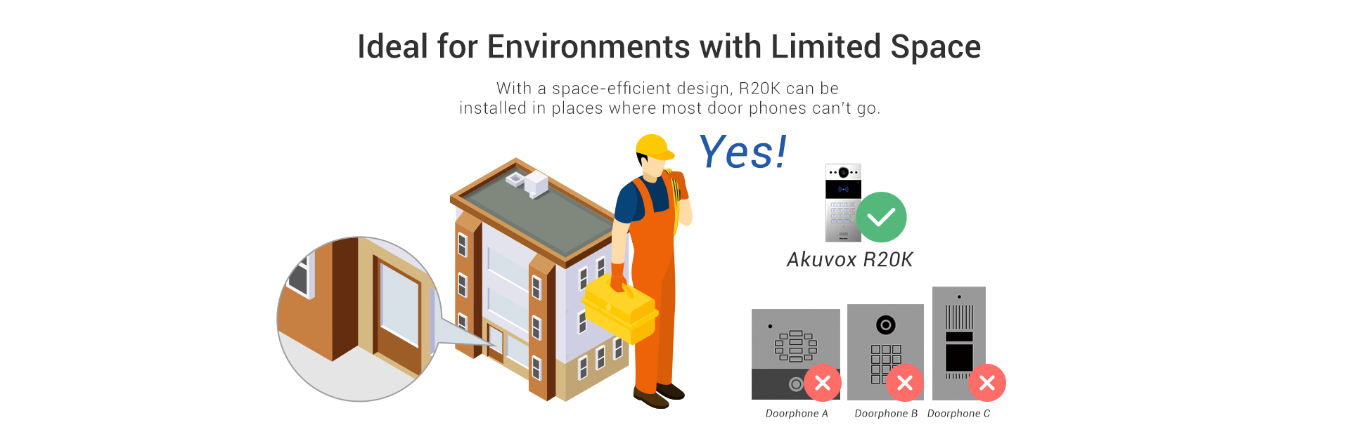 Space-saving and highly compatible, Akuvox R20K is a compact SIP video doorphone with a numeric keypad. It is typically used in apartment and office buildings.