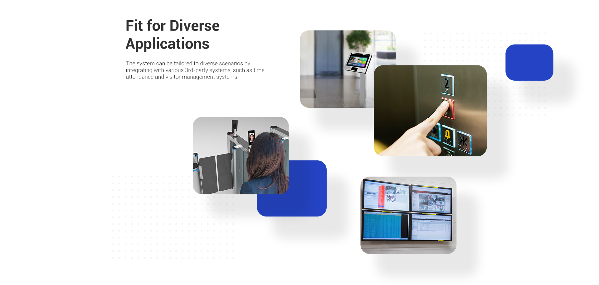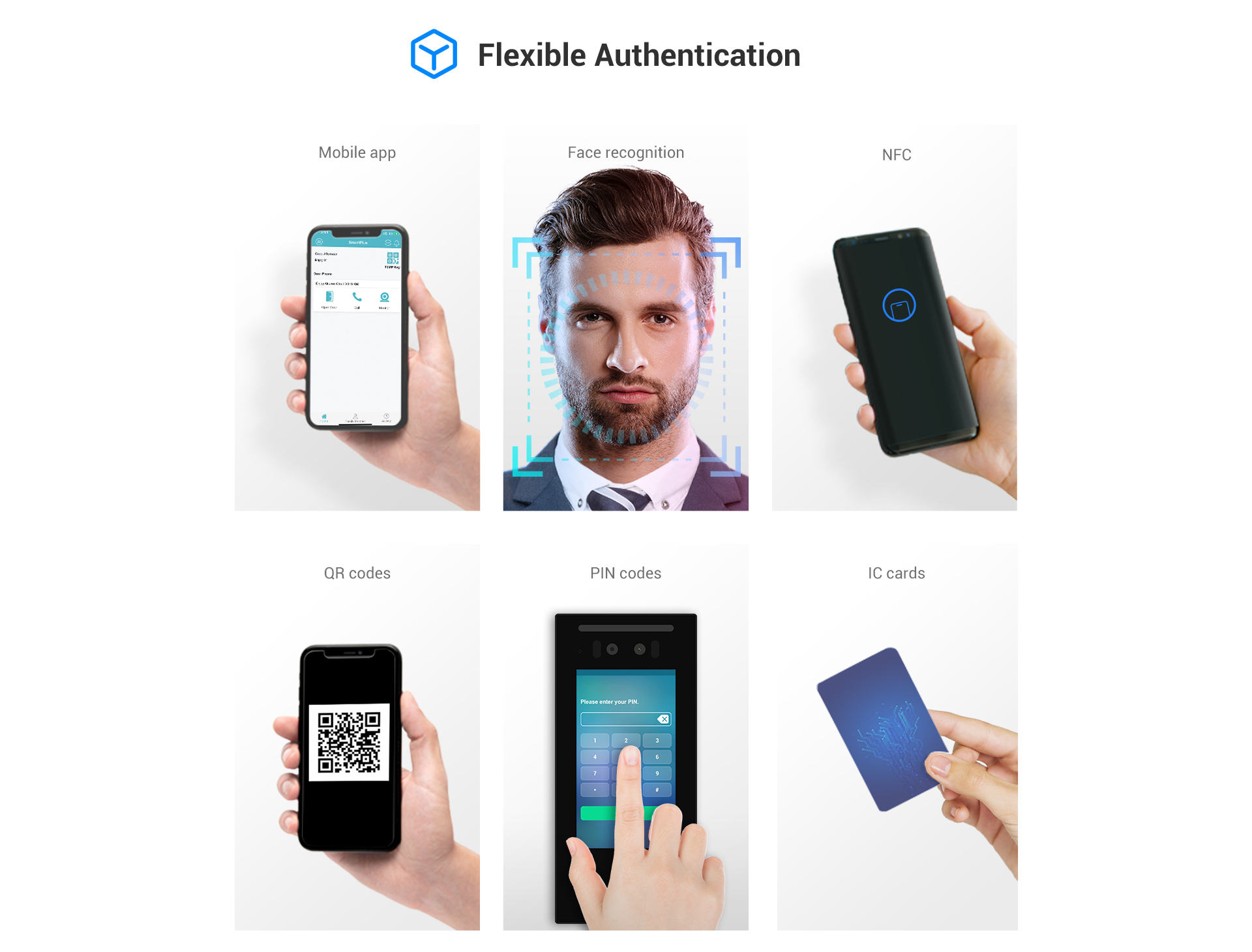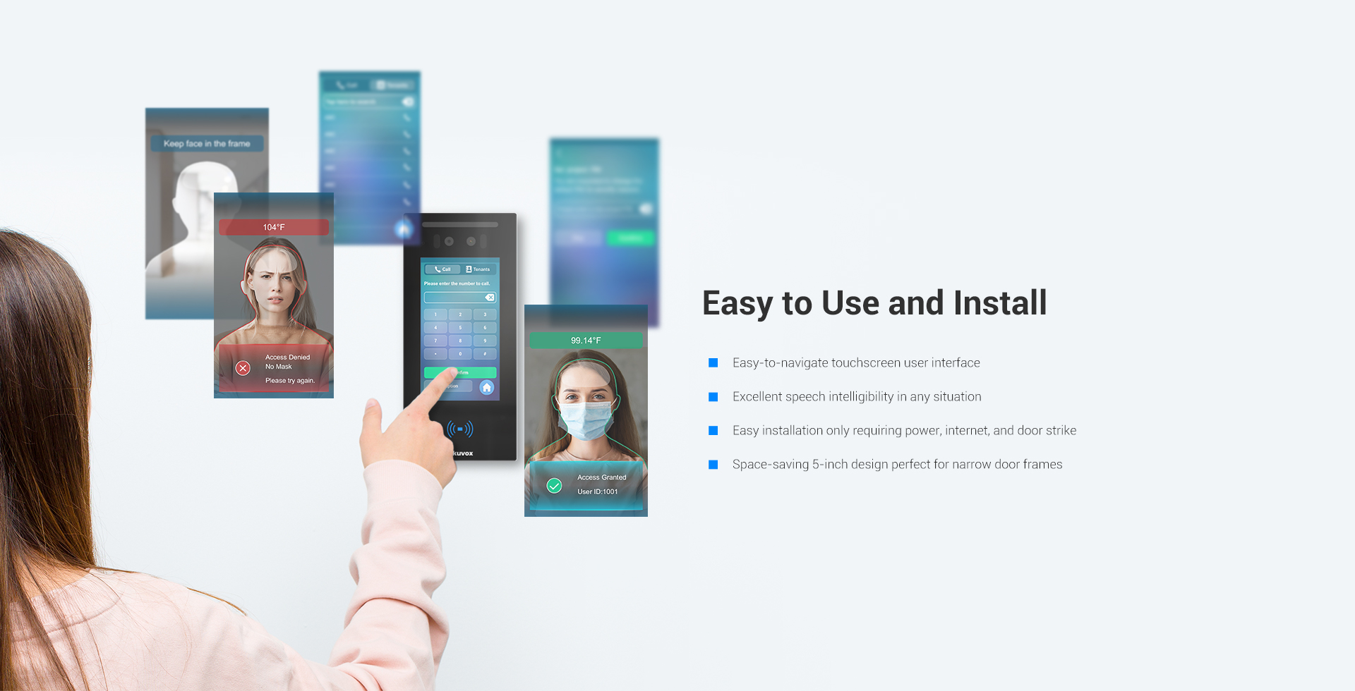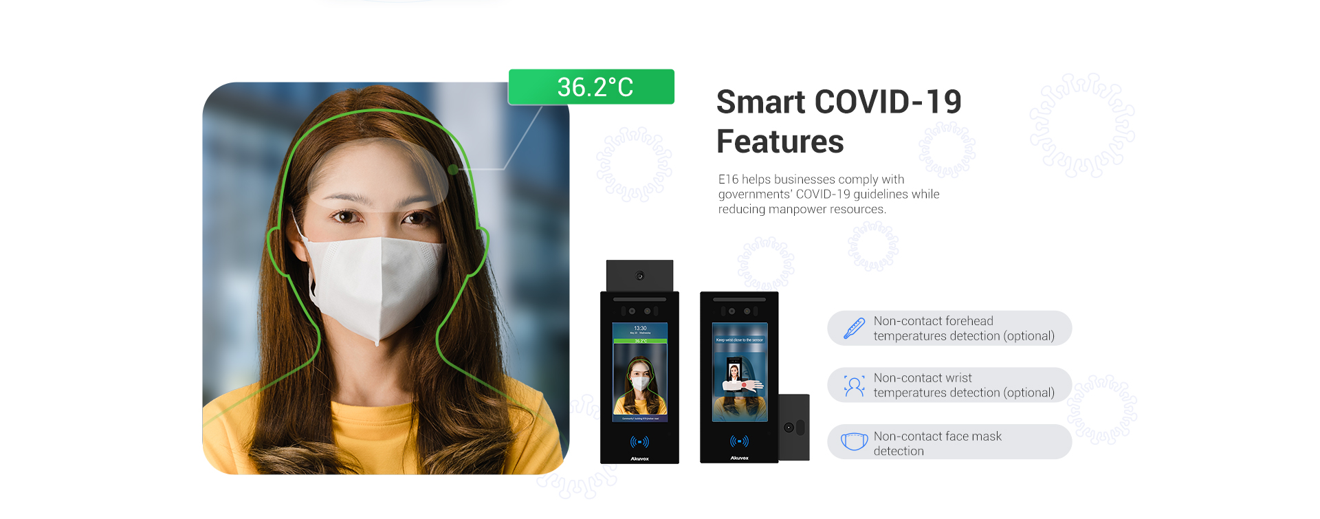 Face recognition, mobile access, temperature measurement, and mask detection in one device.