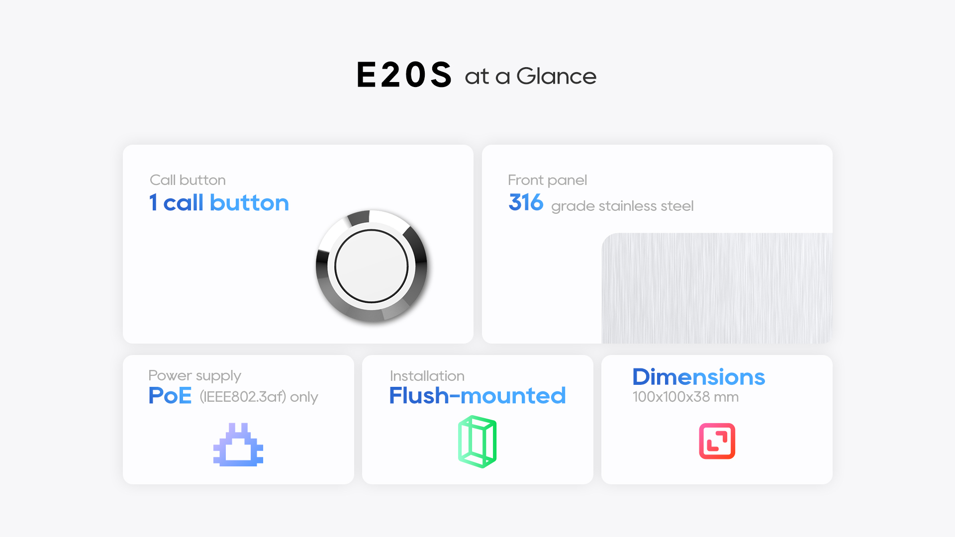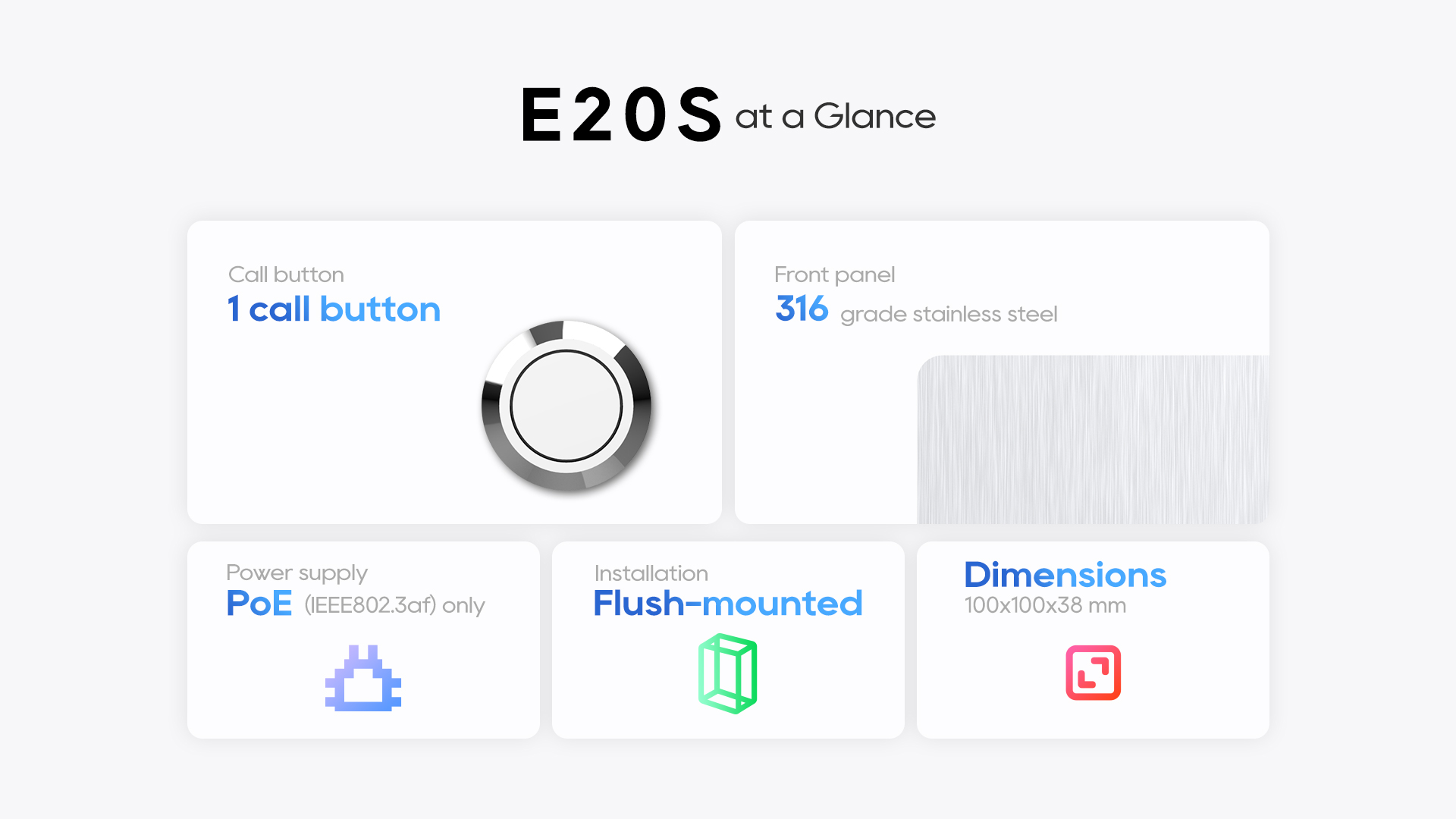 E20S is a compact SIP emergency intercom that is ruggedized with 316-grade stainless steel. It is designed for indoor use and is compatible with 1299 and 86 type single in-wall boxes.